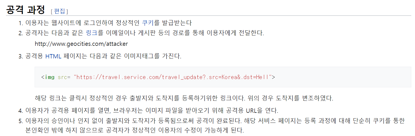 사용자가 웹사이트에 로그인 상태에서 사이트간 요청 위조 공격 코드가 삽입된 페이지를 열면, 공격 대상이 되는 웹사이트는 위조된 공격 명령이 믿을 수 있는 사용자로부터 발송된 것으로 판단하게 되어 공격에 노출된다.